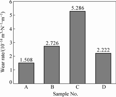 比较试样A、B和C的摩擦面形貌,并结合上述分析可以知道,随着石墨粒度的减小,摩擦面上电弧烧蚀特性逐渐减轻而磨粒磨损特性则逐渐明显。同时,结合相应的磨损结果(见图4)可以推断,磨粒磨损对材料磨损率的直接影响要高于电弧烧蚀对磨损率的直接影响。