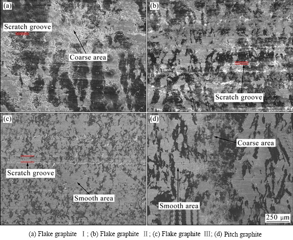 图5所示为不同试样的摩擦表面。由图5可以发现,随着石墨粒度的降低,试样摩擦表面的犁沟变得稀疏,而其宽度逐渐变宽,同时,铜基体的形貌特征由粗糙向平滑转变。而添加沥青石墨的试样表面的犁沟较细,且其中大部分铜基体是以平滑状态分布于材料中。