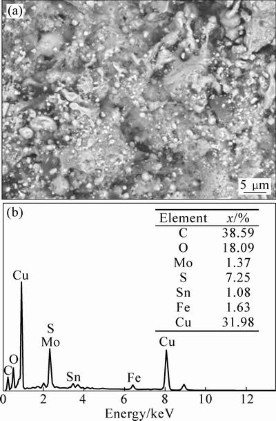对比各试样试验前后的表面形貌,试样A在试验前后的主要变化是铜基体形貌更加粗糙。图6(a)所示为是试样A(见图5(a))中的粗糙区域(Coarse area),可以发现,该区域存在着大小不一的液滴状颗粒,并且许多颗粒已附着在石墨表面上。图6(b)所示为该区域的能谱,可以发现氧的明显存在。因此,推断这些区域是在电弧的高温作用下,局部区域瞬间形成熔池后,铜液凝固所形成,而这些区域即为电弧烧蚀区;试样B除了在摩擦表面出现电弧烧蚀区外,其变化还体现在摩擦面上铜相的扩大和石墨相的缩小;而试样C在摩擦前后的主要变化则是以铜相扩大和石墨相缩小为主,且伴随着摩擦面上大量的孔洞消失。摩擦面上铜相和石墨相的变化,是因为在摩擦过程中表层的材料剥落形成磨屑,构成磨粒磨损。其中,材料内部石墨被挤出,并以润滑层的形式存在[13-14];由于铜基体较软,在剪切应力的作用下,铜凸点能铺展摩擦面而形成铜相扩大的形貌。对于含有粘结剂的试样D而言,其试验前后的变化与试样B相似,也是以出现电弧烧蚀区及铜相和石墨相的变化为主。