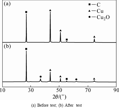 3) 在摩擦过程中,氧分子可以通过材料孔隙或铜与石墨之间的孔隙通道渗入材料的基体,对材料内部产生深层氧化;摩擦过程中生成的Cu2O和CuO使电阻率提高,降低了试样在服役条件下的稳定性和使用寿命。