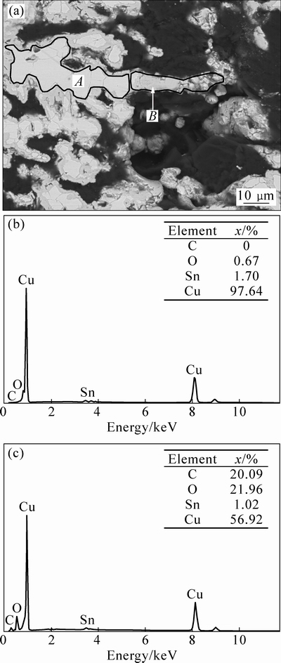 由图7中试样C在试验前后的XRD结果可知,试验后,试样中的Cu含量减少,并且有明显的Cu2O产生。这是由于在大气中,Cu存在如下氧化反应:185~200 ℃时,2Cu+1/2O2=2Cu2O;350 ℃以上时,Cu2O+1/2O2=2CuO。图8所示为试样C试验后的剖面SEM像以及能谱分析。如图8(a)所示,在白色区域部分存在两种衬度,其中衬度较亮的区域被低衬度相所包围。对比图8(b)、(c)可以知道,暗衬相中的氧含量明显高于亮衬相。结合XRD分析,能够推断出亮衬区域为Cu,暗衬区域为Cu2O。同时,在图8(a)中可以发现,Cu2O分布在Cu基体周围的现象,尤其在孔洞以及铜与石墨交界处更加明显,这表明在摩擦过程中,不仅在试样表面会形成氧化膜,而且氧分子还可以通过材料的孔隙或铜与石墨之间的孔隙通道渗入材料的基体,对材料内部产生深层氧化[19]。