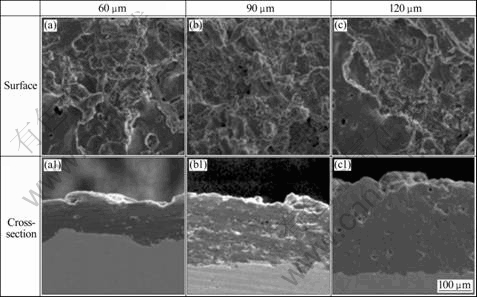 Fig.1 Surface and cross-section morphologies of Al thermal spray coatings with different thickness