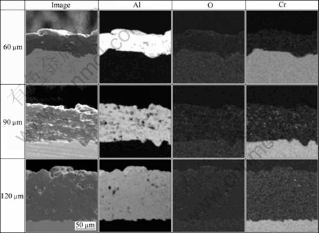 However, the traces of dissolution reaction in 120 μm thickness coating appeared, and the corrosion product was observed at restricted area. In conclusion, the corrosion resistance is increased with the coating thickness increasing. There is a result by other researchers that the corrosion product is mainly composed of Al (OH)3[11].