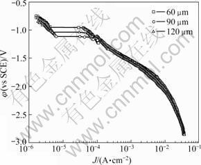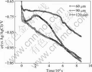 Fig.3 presents the potential of thermal spray layer in seawater. The potential at early stage shifted to negative direction. For 120 μm thickness coating, the stable potential maintained at about 4 000 s. Thereafter, it shifted slowly to negative direction, and displayed dramatically declination at 57 000 s. Furthermore, for 90 μm thickness coating, it moved to negative direction steadily until 7 000 s and increased to noble potential. The potential of -0.74 V maintained at 20 000 s, and then moved to negative direction continuously until experiment completion. Meanwhile, the potential of 60 μm thickness coating steadily decreased. Overall, the potential presented the higher potential with the increase of coating thickness. It is considered that the noble potential kept up because chloride ion in seawater is hard to penetrate with the thickness increasing, and also the potential with time increasing in thick coating shifted to the negative direction.