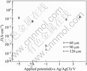 Fig.7 shows the current density after potentiostatic potential experiment for 1 200 s of thermal spray coating. For all thermal spray coating thickness, the lowest current density displayed at -1 V (around open circuit potential). Also, at -1 V, the highest thickness coating displayed the lowest current density. At 2 V, the coating of 120 μm thickness displayed the highest current density. This is because of the effect of activation polarization by hydrogen gas at cathodic polarization, and by the strong active dissolution reaction at anodic polarization.
