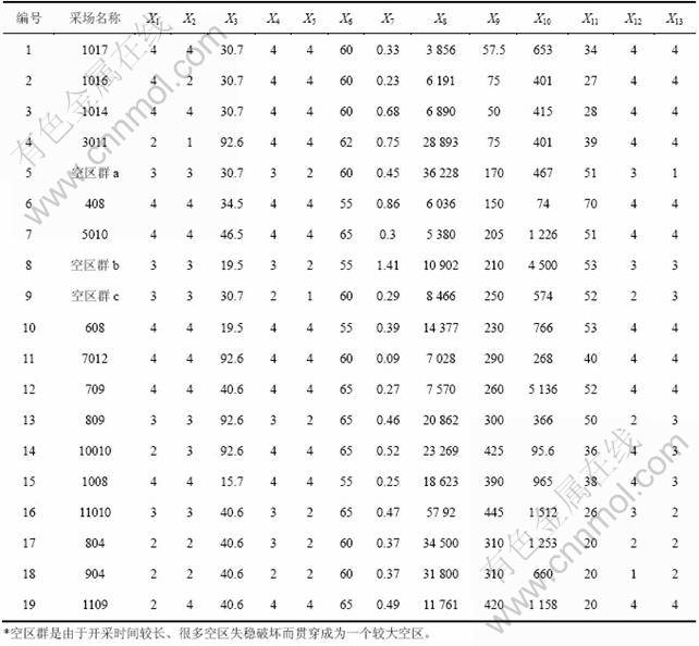 参考文献[8]中关于空区危险度的分类,结合矿山的实际情况,提出表3和表4所示的采空区危险性评价的定性指标分级、赋值与分级标准,把采空区的危险程度分为4个等级,依次是:危险度极高(Ⅰ级)、危险度较高(Ⅱ级)、危险度一般(Ⅲ级)和危险度较低(Ⅳ级)。老鸦巢矿主要采空区各因素调查结果见表5。