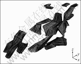 根据采空区的实际大小、位置,运用GTS-MADIS软件建立模型,如图1所示。根据圣维南原理,围岩区域要足够大才能消除局部效应的影响,但考虑到实际条件的影响,取采空区范围的3~5倍,建立的模型如图2所示。经数据处理软件查询得该空区所处的空间位置为:模型长度1 290 m,宽度900 m,埋深-415~184 m。采空区围岩及顶板组成的模型网格共有205 866个单元和40 554个节点。
