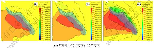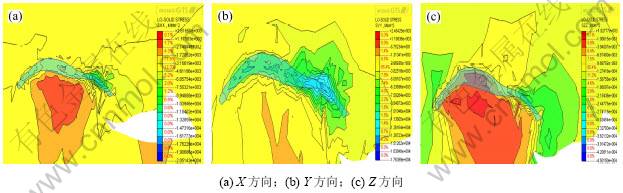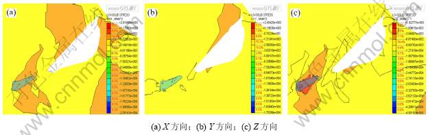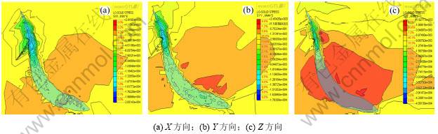 (4) 由图6可知:11010采空区顶板各方向应力范围分别如下:X方向为+1.170 83~-4.611 86 MPa;Y向应力局部出现一定程度的拉应力,为-2.569 30~ -13.872 3 MPa,Z方向为+1.927 77~-21.543 6 MPa。其中X和Z方向所受到的拉应力小于顶板本身的极限抗拉强度(+2.800 00 MPa),其压应力均小于矿柱本身极限抗压强度(-22.190 00 MPa),故其相对稳定,但X和Z方向上盘出现较大面积的拉应力,建议对其上盘处进行监测。