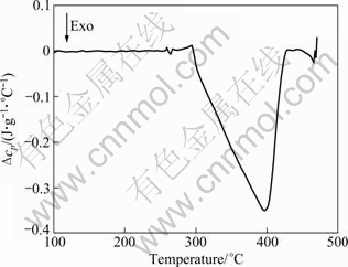 The DSC result shown in Fig. 1 is obtained in the cooling process of the solid solution alloy with the cooling rate of 5 ℃/min. This curve has an exothermic peak (396 ℃) which arose from the precipitation of second phase.