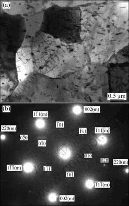 The precipitates are easy to nucleate at the gain boundaries because the high dislocation density is suitable for the diffusion of the solute elements at the grain boundaries. The precipitates belong to η phase and the orientation relationship (in the selected area) between precipitates and matrix can be confirmed according to selected area electron diffraction (SAED) pattern (Fig.2 (b)): η2—{00.1}η∥{111}Al, {10.0}η∥{011}Al.