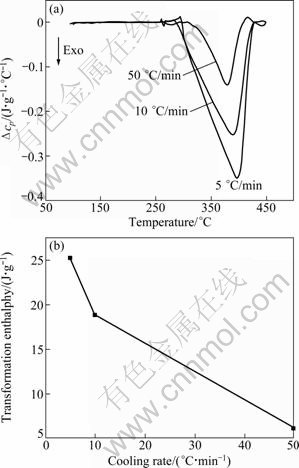 Fig. 3 DSC thermograms of 7A09 alloy cooled at different cooling rates (a) and relationship between transformation enthalpy and cooling rates (b)