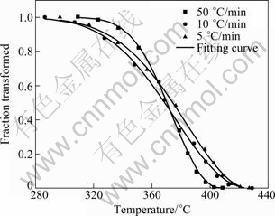 Fig. 5 Relationship between fraction of precipitation and temperature for 7A09 alloy cooled at different cooling rates