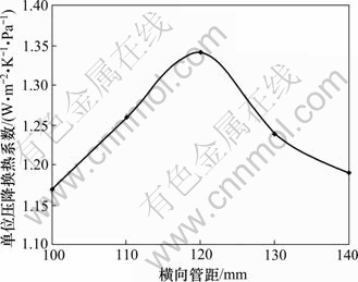 为优化目标。图8所示为横向管距变化下单位压降换热系数。由图8可知:在横向间距120 mm处,单位压降换热系数达到最大值,换热器性能最优。根据换热器的设计计算公式,横向管距ST=1.02~1.5df,df为翅片外直径,本文所用换热器df为96 mm,横向管距的范围为98~144 mm。综上所述,换热器横向管距的最优值在114~120 mm 之间。