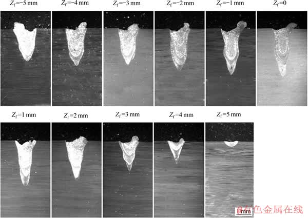 1) 离焦量。离焦量Zf是指激光焦点位置与工件被加工面之间的距离(mm)。当焦点的位置恰好位于工件的上表面时,Zf =0 mm;焦点位于工件上方为正离焦;位于工件内部则为负离焦。本实验总结并参考其他研究工作的结果,将焊接速度和激光功率分别设定在3 m/min、1 500 W,离焦量Zf以1 mm为一个增量,从-5mm变化到+5 mm。