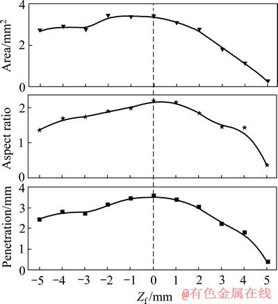 图2所示为焊缝的熔深(penetration)、深宽比(aspect ratio)及横截面积(cross-section area)随离焦量的变化曲线。从图2可以更加清楚地看出,Zf在-2~0 mm的范围内变化时,焊缝的横截面积几乎无变化,这说明在此范围内改变离焦量对焊接热输入的影响不大。另外,焊缝的深宽比呈现出和熔深类似的变化趋势,在Zf =0 mm时,达到最大值,正、负离焦均将导致深宽比减小。