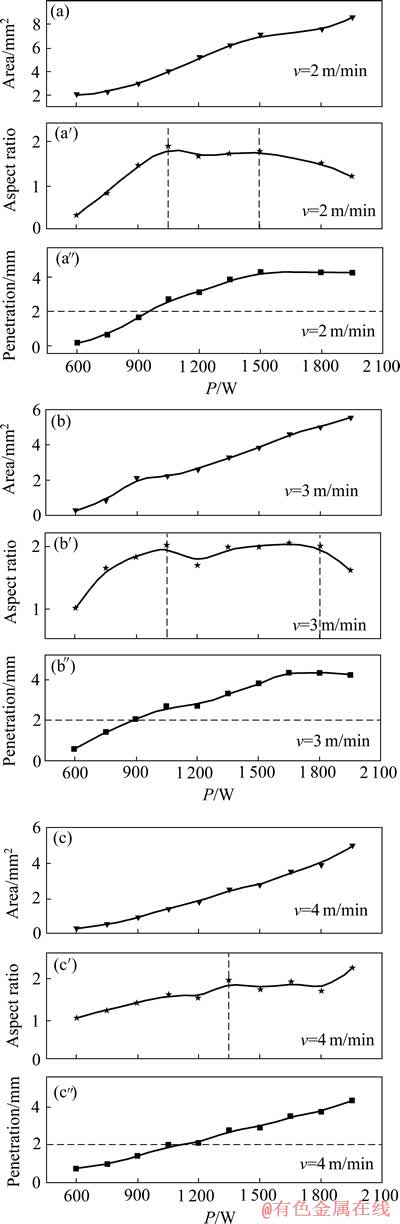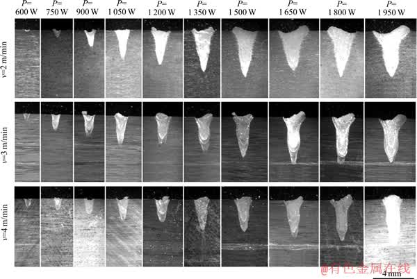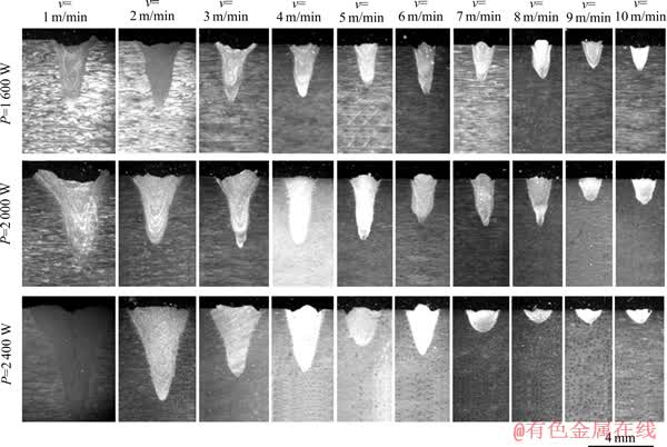 综上所述,v为2~4 m/min是ZK60镁合金较为合适的激光焊接速度范围。在该速度范围内,激光可以产生较显著的深熔效果,且焊缝可以获得较大的深宽比。因此,在随后的实验中,将在优化的焊接速度范围内选定焊接速度,在此基础上研究激光功率对熔池几何形状的影响规律。