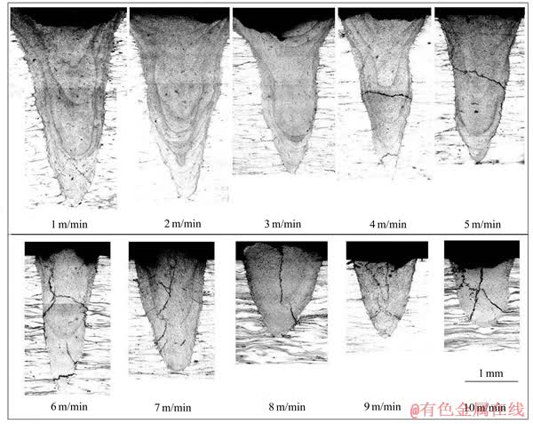 焊后截取小块焊缝横截面试样,在5%酒石酸溶液中侵蚀5s,进行金相观察,并采用像素法测量熔池的几何尺寸(熔深、宽度、深宽比和横截面积等)和裂纹长度。