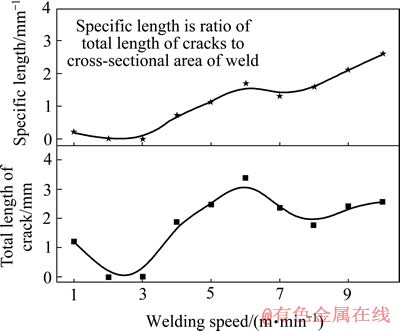 图8所示为激光功率P=1 600 W时焊接速度对结晶裂纹长度的影响规律。从图8可以看出,焊缝中结晶裂纹的总长度随焊接速度的变化规律较为复杂。实际上,结晶开裂发生于熔池区,裂纹的长度往往会受到熔池尺寸的影响,因此,采用裂纹的比长度(即裂纹总长度和焊缝横截面积的比值)来衡量热裂倾向更具科学性。显然,在v≥4 m/min时,焊缝的结晶开裂倾向随着焊接速度的增大而增大。此外,激光功率P=2 000 W和2 400 W的两组试样也呈现了类似的变化规律。因此,对于ZK60镁合金的激光焊接,宜采用低速焊,焊接速度应控制在1~4 m/min范围内,在此范围内可以一定程度上降低焊缝的热裂纹敏感性。