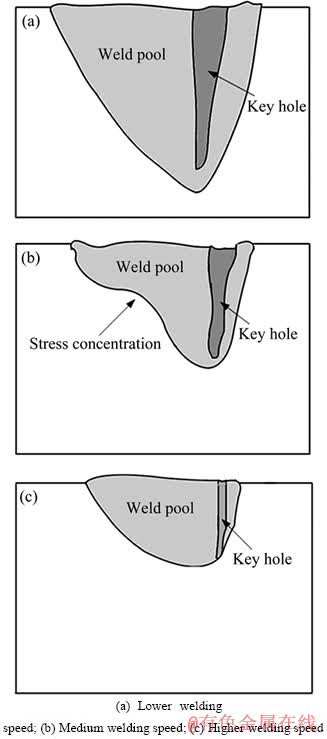 Fig. 9 Schematic illustration of longitudinal sections of weld pool under different welding speeds[18]