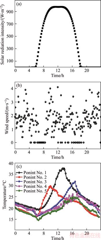 From Figure 4(a), the intensity of solar radiation increased gradually with the sunrise, and reached a peak value of 960 W/m2 at 12 o’clock. And then it decreased to 0 W / m2 gradually with the sunset. Usually, the wind speed was changed randomly, which depends on the detailed weather. Taking point No. 1 for example, the wind speed was measured to vary from 0 m/s to 4.5 m/s (see Figure 4(b)).Although the wind speed is not a dominate factor for the variation of the temperature of the rock face in general, it is vital for the instantaneous change of the temperature, which is important in the establishment of empirical model discussed below.