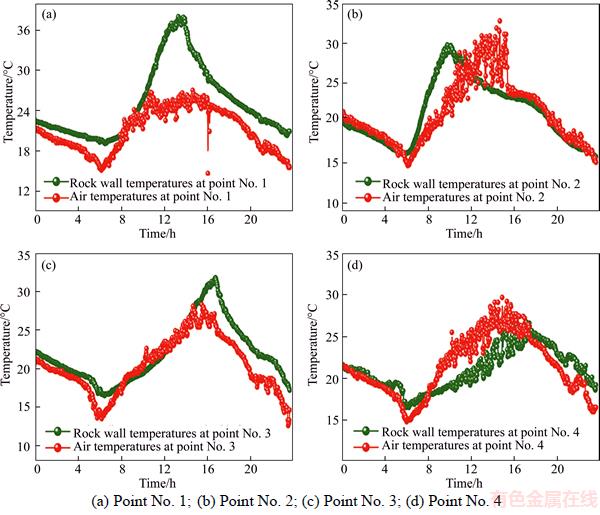 Figure 5 Comparison of diurnal variation of temperature of rock face and air 20 m away from rock face: