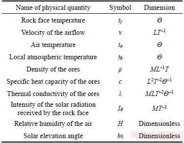 Dimensional analysis is a method of building mathematical models in the physics domain. Based on the principle of the dimensional homogeneity in physical laws and the Buckingham π theorem used for dimensional analysis modeling, the relationship of the corresponding physical variables can be established [25–28]. This mathematical analysis method is a powerful tool for analyzing the rock face temperature of the iron open-pit mine. The basic theorem of dimensional analysis is the π theorem: supposing that the number of physical quantities that affect a phenomenon is n, and the basic dimension number of these physical quantities is m, then the physical phenomenon can be expressed by N=n–m, which is independent of the dimensionless groups [29–31].