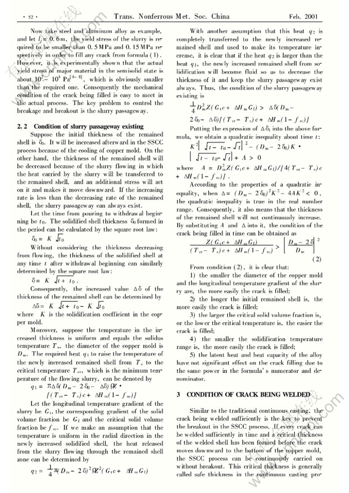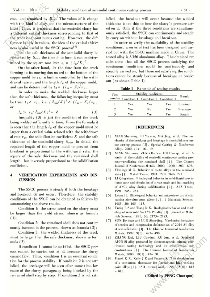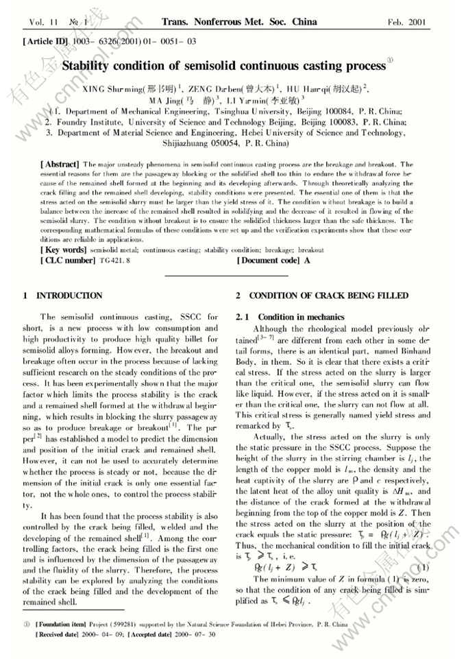Key words:semisolid metal; continuous casting; stability condition; breakage; breakout