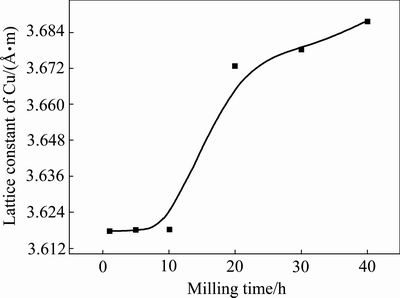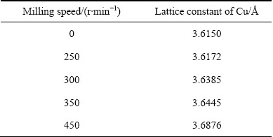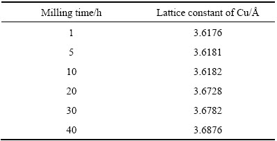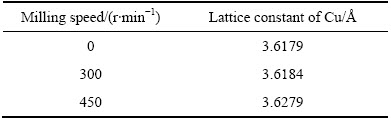 Table 1 Lattice constant of Cu in Cu-10%Sn-5%Bi alloy with 450 r/min milling speed for different milling time