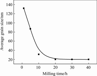 Fig. 3 Change of grain size of Cu in Cu-10%Sn-5%Bi alloy after milling with 450 r/min for different time
