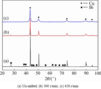 图4 经不同转速球磨40 h后Cu-5%Bi合金的XRD谱