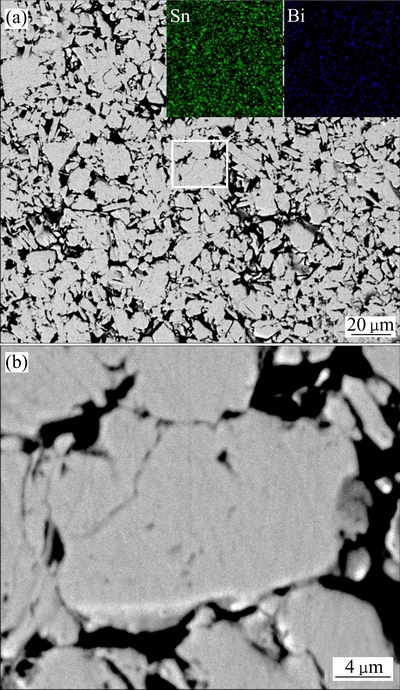 将450 r/min球磨40 h后的Cu-10%Sn-5%Bi合金粉末压制成块体,再将其抛光后进行SEM形貌观察及能谱分析,结果如图5所示。从图5可以看出,压制后的合金块体中存在较多的孔洞,粉末颗粒轮廓形貌清晰,相互之间通过机械咬合结合在一起。对合金生坯高倍观察(见图5(b))没有出现第二相的衬度,这也与图1中球磨40 h后的XRD结果一致,即此时合金仅由单相Cu的过饱和固溶体组成。另外,从合金低倍下能谱面扫面结果(见图5(a)中插图)可以看出,合金中Sn、Bi元素较为均匀弥散分布在铜合金基体中。