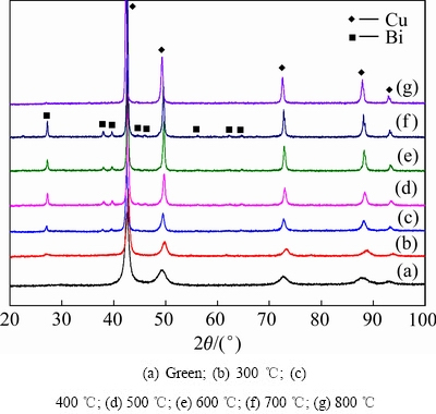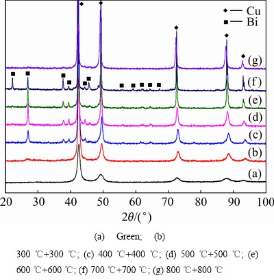 图7 经不同温度两次烧结后Cu-10%Sn-5%Bi合金的XRD衍射谱