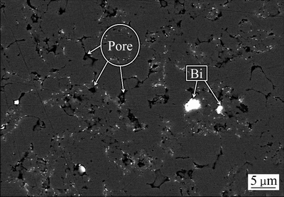 3) 高能球磨制备的Cu-10%Sn-5%Bi合金粉末,在烧结过程中,Bi相从Cu的过饱和固溶体中析出,而Sn则继续保持固溶在Cu中,最终获得较细小的Bi相均匀分布在Cu(Sn)基体上。