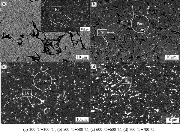 图9 经不同温度两次烧结后Cu-10%Sn-5%Bi合金的SEM背散射像