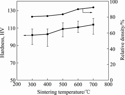 图10 经不同温度两次烧结后Cu-10%Sn-5%Bi合金的致密度及显微硬度随温度的变化