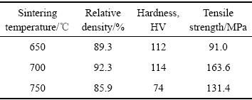 为了确定700 ℃是否为本“复压复烧”工艺制备合金块体的最佳烧结温度,进一步尝试采用650 ℃及750 ℃温度对合金块体进行烧结,并与700 ℃烧结后的合金块体进行力学性能对比,如表5所列。从测试结果来看,经700 ℃烧结后的合金块体的致密度、硬度均相对较高。此外,还可通过测试合金块体的拉伸强度来判断合金的烧结性能。从拉伸强度测试结果(见表5)来看,经700 ℃烧结的合金块体拉伸强度高达 163 MPa,表明在该温度下制备的合金具有最优的力学性能。