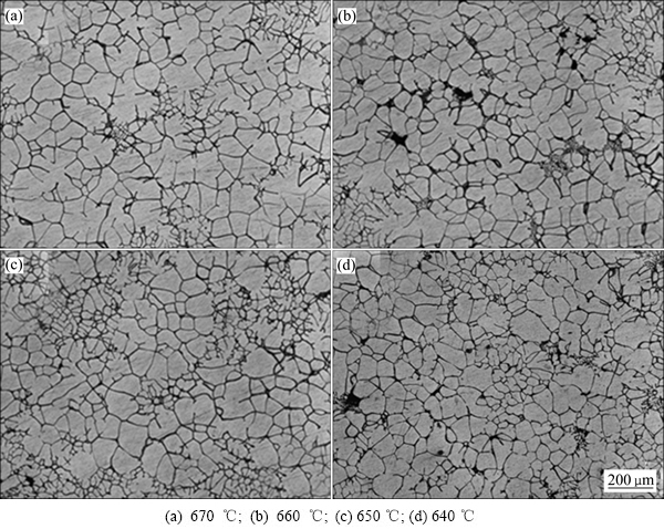 图1所示为不同浇注温度下低过热度电磁搅拌制备的7A04铝合金半固态浆料的显微组织(搅拌功率为0.4 kW/kg,搅拌时间60 s)。由图1(a)可知,当铝液浇铸温度为670 ℃时,7A04铝合金半固态浆料组织中的初生α(Al)晶粒较为粗大,含有大量蔷薇状的晶粒;当浇注温度降为660 ℃时,7A04铝合金半固态浆料组织(见图1(b))中的初生α(Al)晶粒尺寸有所减小,但仍然明显可见一些蔷薇状晶粒;当浇注温度为650 ℃时,7A04铝合金半固态浆料组织(见图1(c))中的初生α(Al)晶粒细小,且绝大部分初生晶粒呈颗粒状,仅有极少量蔷薇状晶粒;浇注温度降至640 ℃时,7A04铝合金半固态浆料组织(见图1(d))中的初生α(Al)晶粒有进一步的减小,绝大部分的初生晶粒呈颗粒状。可见,随着浇注温度的降低,7A04铝合金半固态浆料的初生α(Al)晶粒由蔷薇状向颗粒状转变,且晶粒尺寸减小。