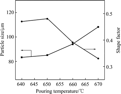 图2所示为不同浇注温度下,低过热度电磁搅拌制备的7A04铝合金半固态浆料微观组织的定量金相统计结果。由图2可知,7A04铝合金半固态浆料组织中的初生α(Al)晶粒的平均晶粒直径随着浇注温度的降低而减小,浇注温度为670 ℃时,7A04铝合金半固态浆料组织中的初生α(Al)晶粒的平均晶粒直径为108.2 μm,当浇注温度降至640 ℃时,初生α(Al)晶粒的平均晶粒直径降为83.3 μm。