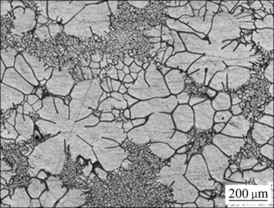 图3所示为7A04铝合金在650 ℃下浇注至电磁搅拌炉中不进行电磁搅拌,浆料随炉冷却静置至627 ℃所得的浆料组织。由图3可知,未经电磁搅拌的浆料组织中的初生α(Al)很粗大,呈枝晶状或蔷薇状,浆料质量较差。通过定量金相统计分析得出,在627 ℃下,直接浇注未经电磁搅拌的7A04铝合金半固态浆料组织中的初生α(Al)晶粒的平均晶粒直径达到了140.1 μm,平均圆整度仅为0.28。