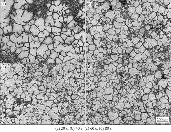 图6所示为浇注温度为650 ℃,名义搅拌功率0.6 kW/kg下经不同搅拌时间后所得的7A04铝合金半固态浆料的显微组织。由图6可知,与未电磁搅拌的7A04铝合金半固态浆料组织(即搅拌时间为0 s,如图5所示)相比,搅拌时间为20 s的7A04铝合金半固态浆料组织(见图6(a))得到了明显的细化,初生α(Al)晶粒的枝晶化得到了一定的改善,但仍存在着部分较大的蔷薇状晶粒;搅拌时间为40 s(见图6(b))时,浆料组织的晶粒尺寸进一步减小,同时初生α(Al)枝晶几乎完全消失,晶粒均呈颗粒状或近球状;当搅拌时间进一步增长为60~80 s时,浆料组织中的初生α(Al)晶粒尺寸有一定程度的细化,但是晶粒形态变化不大,均主要呈球状。