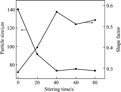 在相同的搅拌功率下,一定范围内搅拌时间越长,电磁搅拌产生的强制对流使晶核更多地分散于整个熔体,熔体的温度场和溶质场也越均匀。故在一定范围内延长搅拌时间均可提高熔体的形核率。但是在大体积浆料弱电磁搅拌中,浆料熔体内部主要晶核来源是浇注时在坩埚壁及附近产生的大量晶核及电磁搅拌产生的晶粒增殖。当在一定搅拌功率下搅拌一定时间后,晶核数量及分散程度和溶质场、温度场均匀性难以继续显著提高,故继续增加搅拌时间,对浆料组织的尺寸和圆整度均难显著改变。在宏观上表现为超过一定搅拌时间范围后,半固态浆料组织的尺寸和平均圆整度变化很小。