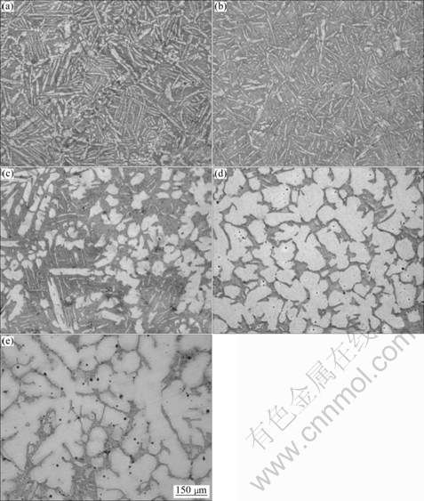Fig.1 Microstructure of Mg-Li-Al-Zn alloy with different electromagnetic stirring voltages: (a) 0 V; (b) 50 V; (c) 80 V; (d) 110 V; (e) 140 V