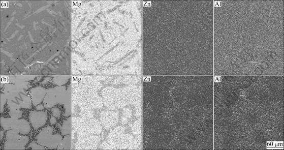 Fig.2 EPMA area analysis of Mg-Li-Al-Zn alloy: (a) 0 V; (b) 110 V