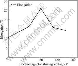 Fig.5 Effects of electromagnetic stirring on elongation of Mg-9Li-5Al-Zn alloy