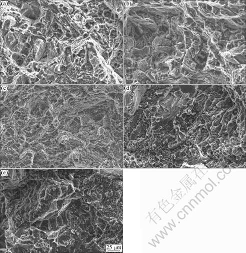 Fig.6 SEM images of tensile fracture surfaces of Mg-9Li-5Al-Zn alloy with different stirring voltages: (a) 0 V; (b) 50 V; (c) 80 V; (d) 110 V; (e) 140 V