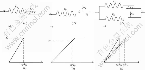 The damages, crack, microcrack and holes, exist in the rock after long geologic motion. Now the combination with cementation bars was used to describe rock and solid bodies with crack[8-9]. This combination was taken as a part to describe rock mass by combining Bingham bodies in this work. There are a few cracks that are discontinuous inside rock and cemented matter exists among these cracks, which can be described by the combination of a cementation bar and a slice in parallel. The cementation bar is equivalent to cemented matter and the gliding slice’s friction is considered the friction of crack. Therefore, it is concluded that rock bodies are made up of the microstructures as shown in Fig.1. These microstructures distribute randomly or in an ordered arrangement. While loading or after loading and unloading, their distributions perhaps are changed, and their failure types are different in a view macroscopy. Certain distribution of microstructure represents certain type of rock. For example, homogeneous rock can be considered a combination of these microstructures in parallel under uniaxial stress. And rock mass with cracks or rock mass with cracks formed through loading and unloading may be considered a combination of these microstructures in series along one direction or two directions[4, 8-9]. These microstructures connected in some type are connected with a Bingham body in series again to form the constitutive model for rock mass. The response to stresses of microstructure (shown in Fig.1) and its two embranchments are shown in Fig.2.