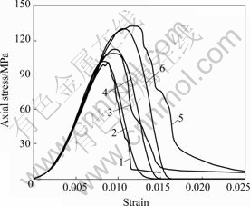 Fig.5 Comparison between calculated results by model in parallel connection and those of experiments under varied confining pressure: 1—Tested result under 2 MPa; 2—Calcu- lated result under 2 MPa; 3—Tested result under 4 MPa; 4—Calculated result under 4 MPa; 5—Tested result under 8 MPa; 6—Calculated result under 8 MPa