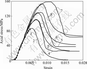 Fig.8 Comparison between calculating results by model’s series type and experiment results: 1—Tested results without confining pressure; 2—Calculated results without confining pressure; 3—Tested results under 3 MPa; 4—Calculated results under 3 MPa; 5—Tested results under 5 MPa; 6—Calculated results under 5 MPa; 7—Tested results under 8 MPa; 8—Calculated results under 8 MPa