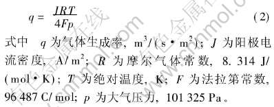 阳极气体是以气泡的形式释放的, 取气泡的当量直径平均值为1cm。 把阳极底掌作为阳极气体的入口, 单位时间单位阳极面积上的气体生成率为[8]
