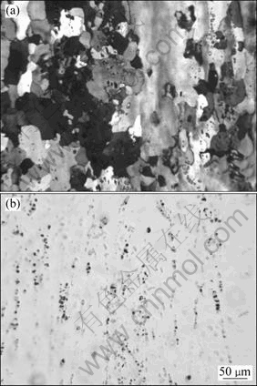 Fig. 2 Microstructures of as-received plate of AlMg6Mn alloy: (a) Grain structure; (b) Particle structure